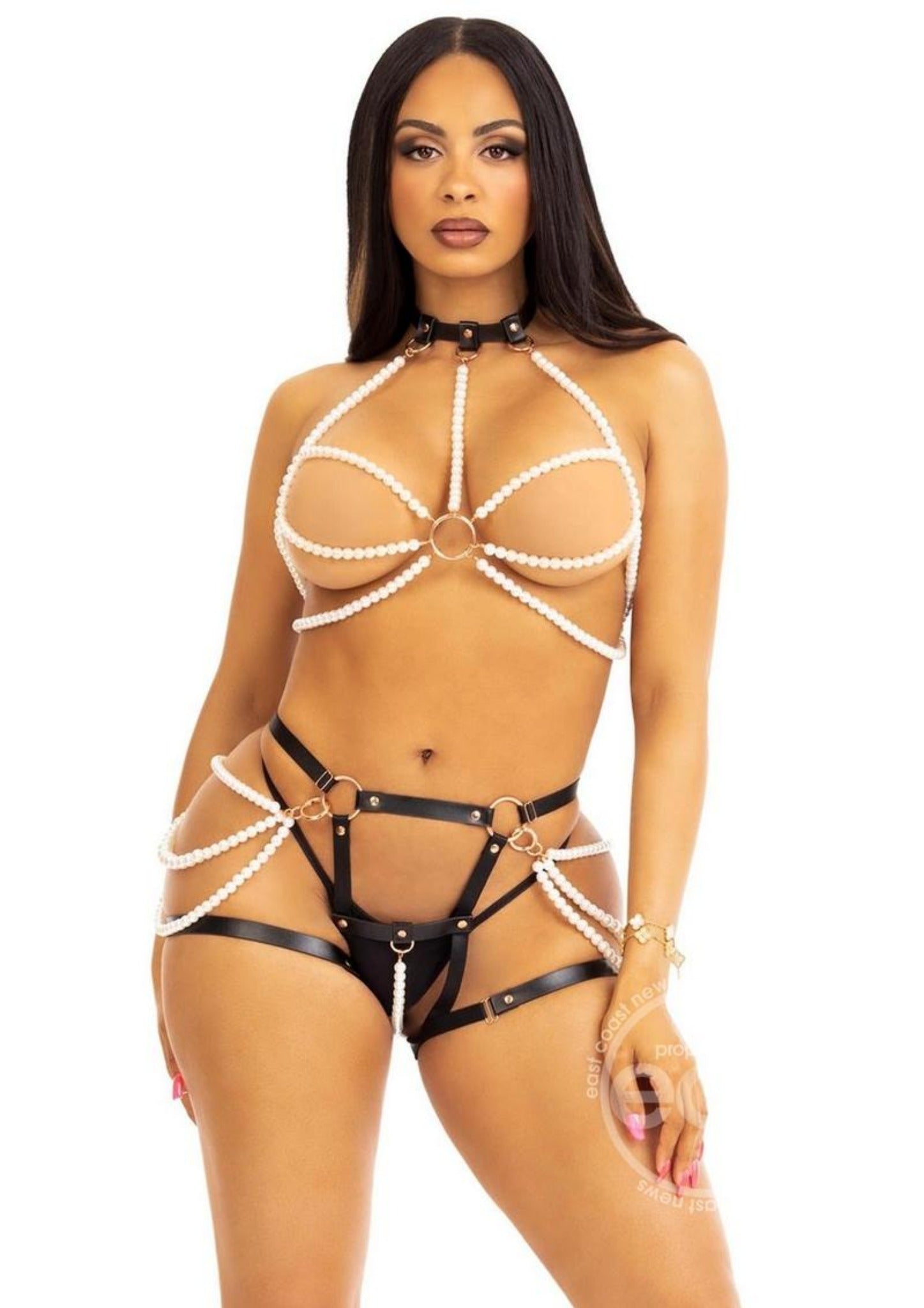 Leg Avenue Faux Pearl Multi Strand Halter Harness with O-Ring Detail and Convertible Vegan Leather Butt Harness (2 Piece) - Small - Black/White