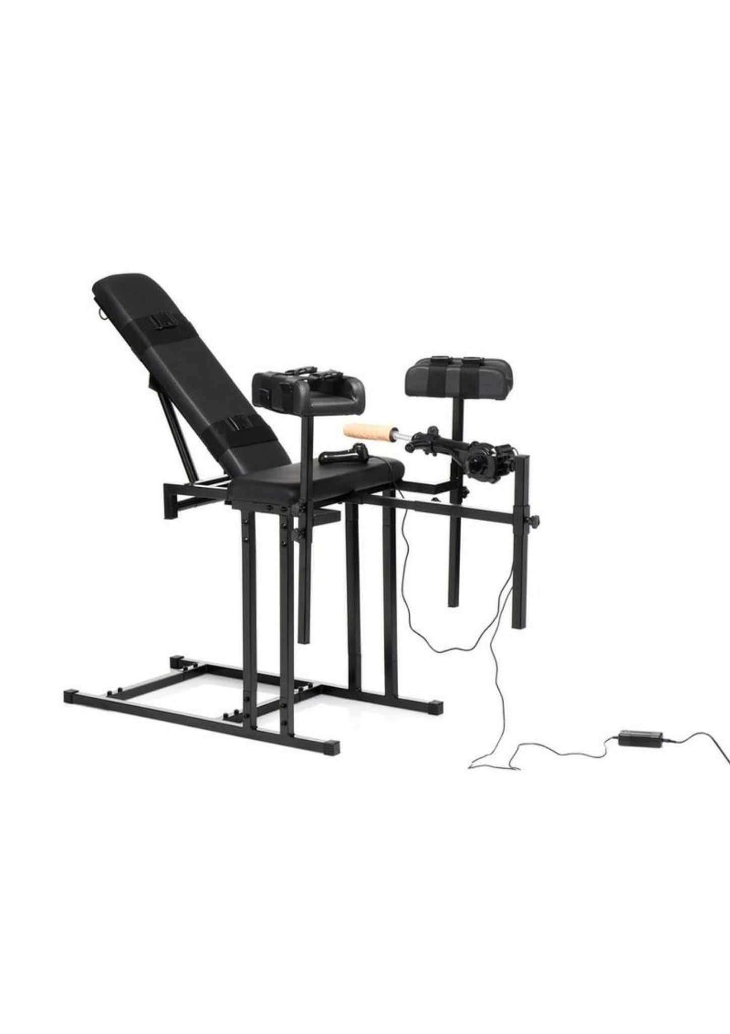 Lean back, put your legs up, and enjoy premium, kinky luxury with this adjustable bondage chair and compatible sex machine attachment! Now you can position yourself or your partner at the angle that works perfectly for you both. This chair has a heavy duty frame that can handle up to 440 lbs (199 kg). With an adjustable backboard, you can sit them upright so they can watch your administrations of pleasure and pain or lay them back so their body relaxes and stretches out, their chest and belly exposed for teasing, sensation play and affectionate touch. Their leg height can also be adjusted for their comfort, as well; have their legs up high or lower them a bit if that works better. The whole chair is adjustable both for your comfort and theirs! As they sink into the plush, foam cushions covered with PVC leather, they'll be able to handle longer scenes and their body will have some padding to push into as you play with them roughly or deliver strong thrusts! To keep them in place, there are straps with ABS plastic buckles that easily secure their legs and chest. Whether it's to keep them safely bound or to keep them from writhing too much in pain or pleasure, these adjustable straps are easy to take on and off for quick changes. On the sides of the board are D-rings for wrist cuffs or other bondage accessories to clip to, as well! It's up to you how you'd like to play!